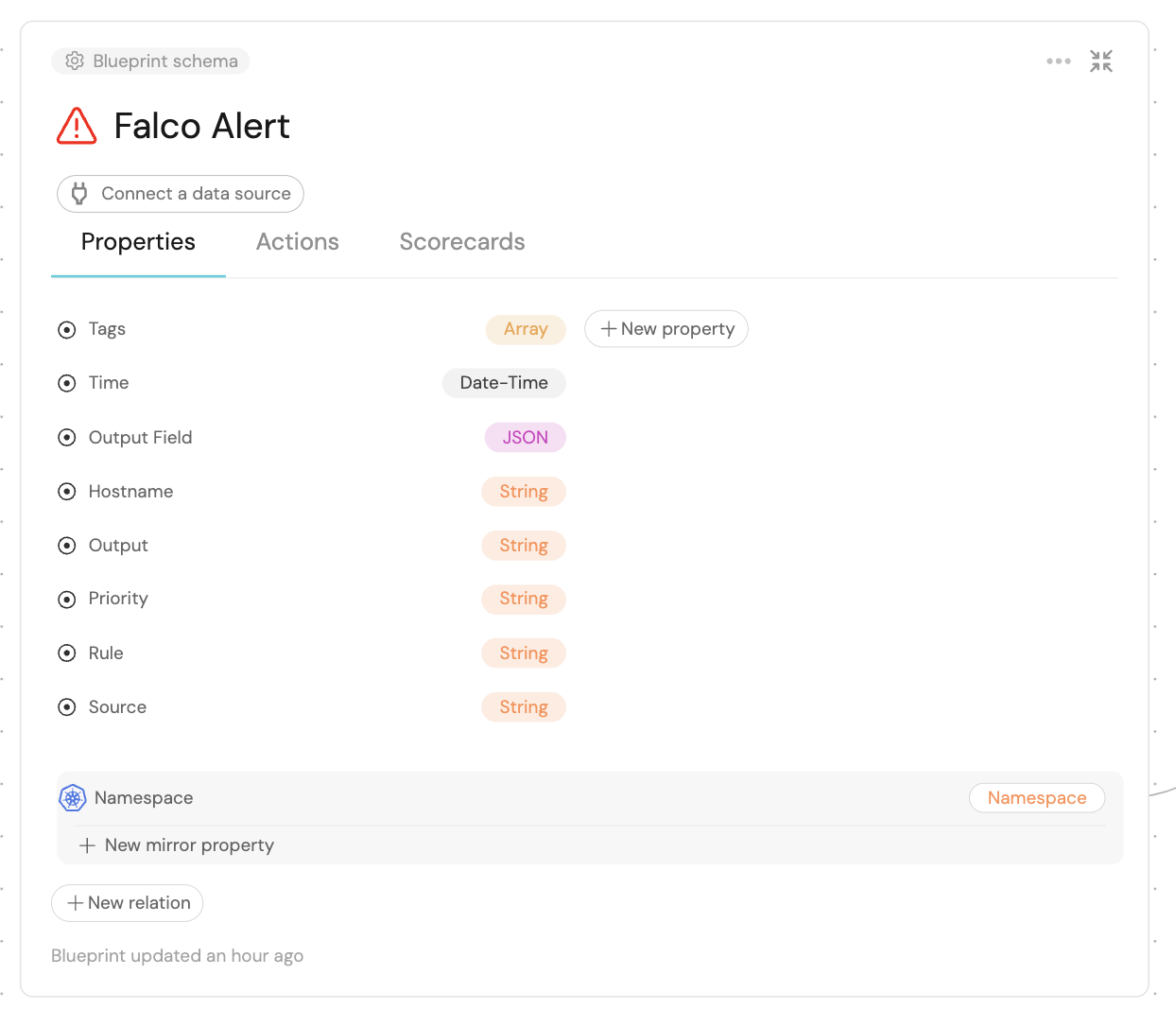 The Falco Rule will likely already have several tags, we ensure we are able to control how these tags are related to the Namespace blueprint. To do this, we prefix the tag name with the keyword port-. With JQ, we can then select the first tag starting with this keyword (Alerts are not supposed to belong to more than one namespace). Hence the name of our example tag being, port-auth-namespace which will correspond to a Namespace entity identified by auth-namespace in Port.