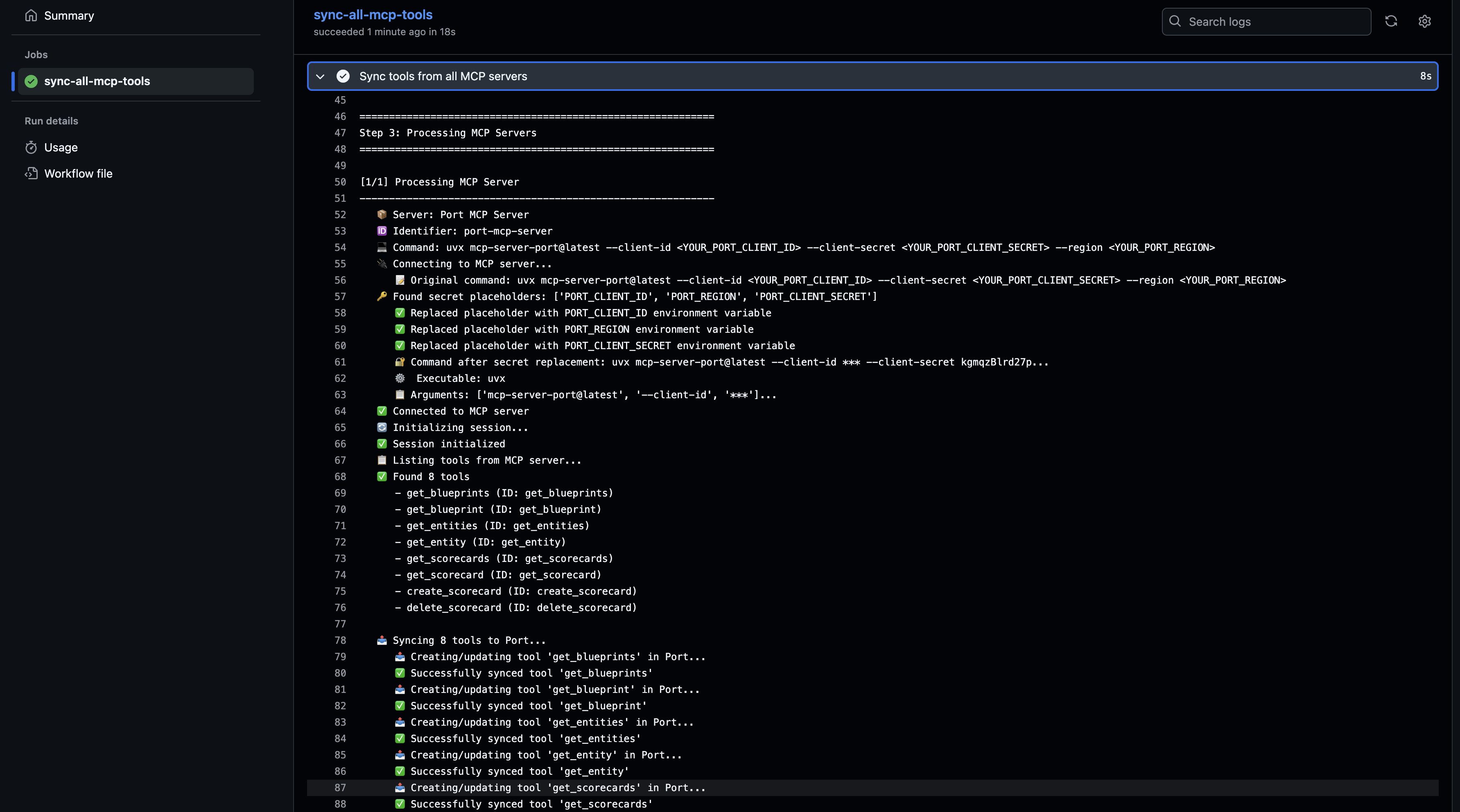 You can find a ready-to-use template for the workflow in the Port experimental mcp server integration repository. Copy this file into your own repository at .github/workflows/extract_mcp_tools.yml.