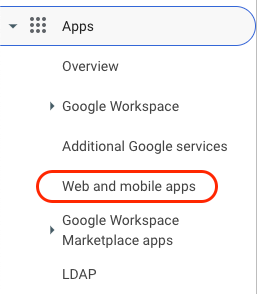 1. In the Google Admin Console, in the sidebar menu, navigate to Apps -> Web and mobile apps:
